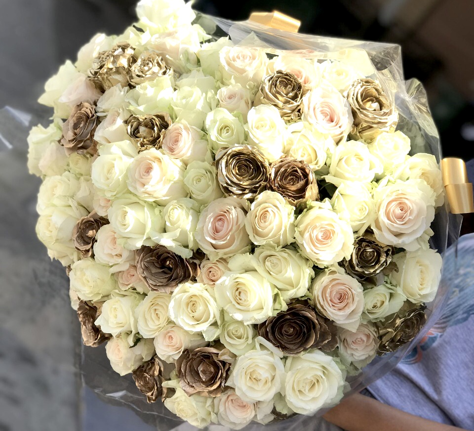 *100 stems of white roses sprayed with gold colour